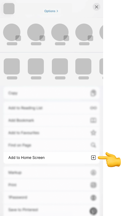 2. In opened menu scroll down, find the button Add to Home Screen and tap.
